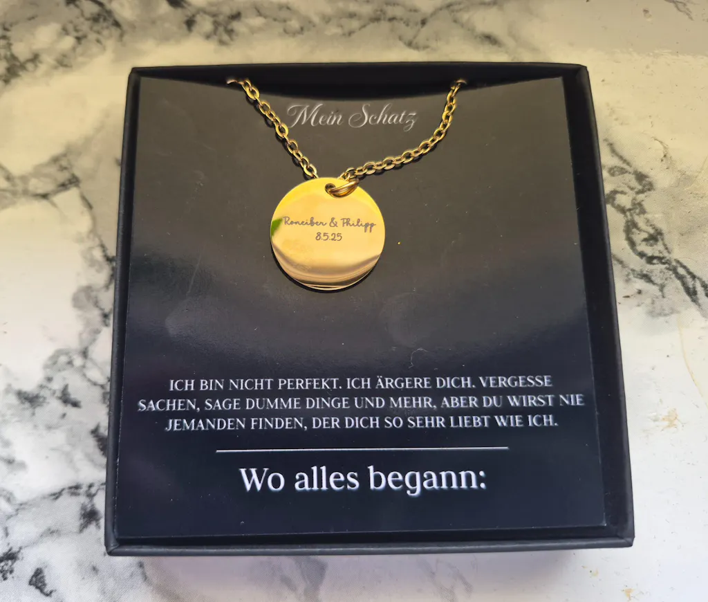 Dank der Lasergravur erhalten unsere Ketten eine professionelle und hochwertige Veredelung, die Ihre individuelle Botschaft oder Ihr Wunschmotiv perfekt zur Geltung bringt.