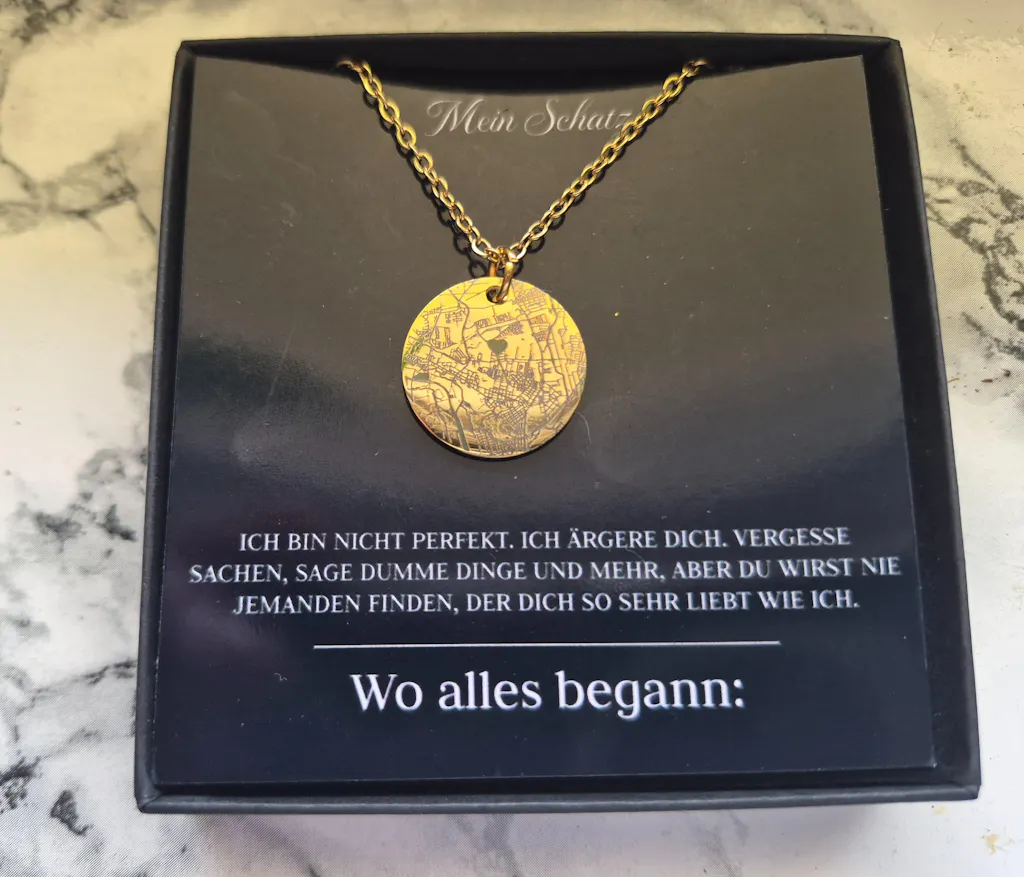 Mach deiner Freundin ein einzigartiges Geschenk zum Jahrestag, zu Weihnachten oder zum Valentinstag. Diese gravierte WO ALLES BEGANN Halskette hält den Tag eures Kennenlernens, oder den Ort eures ersten Kuss für immer fest. Der Tag an dem alles begann als Schmuckstück mit Vorder- und Rückseiten Gravierung. Kette mit Koordinaten Karte und Namen.